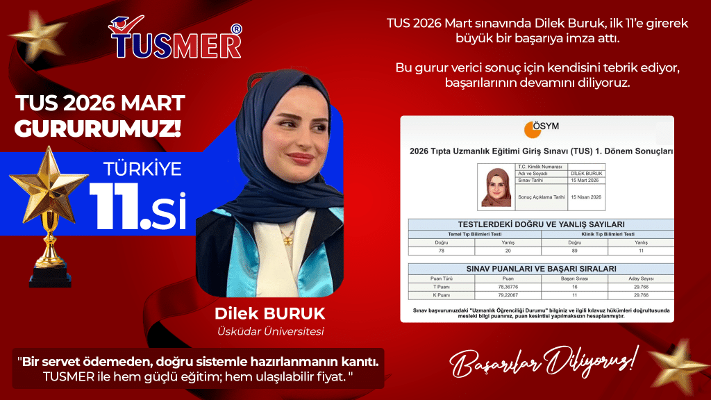 Eğitimin Dönem 1’de başladığı ilk ve tek dershanedir. TUSMER de eğitim dönem 1’de başlar, mezun oluncaya kadar devam eder.Geliştirdiği e-amfi sistemi ile dönem1 – 2 ve 3 de öğrencinin kuruluna özel offline dersler verir. Onun okul başarısını artırır. Sadece TUS değil öğrencinin TIP eğitimini de destekler.